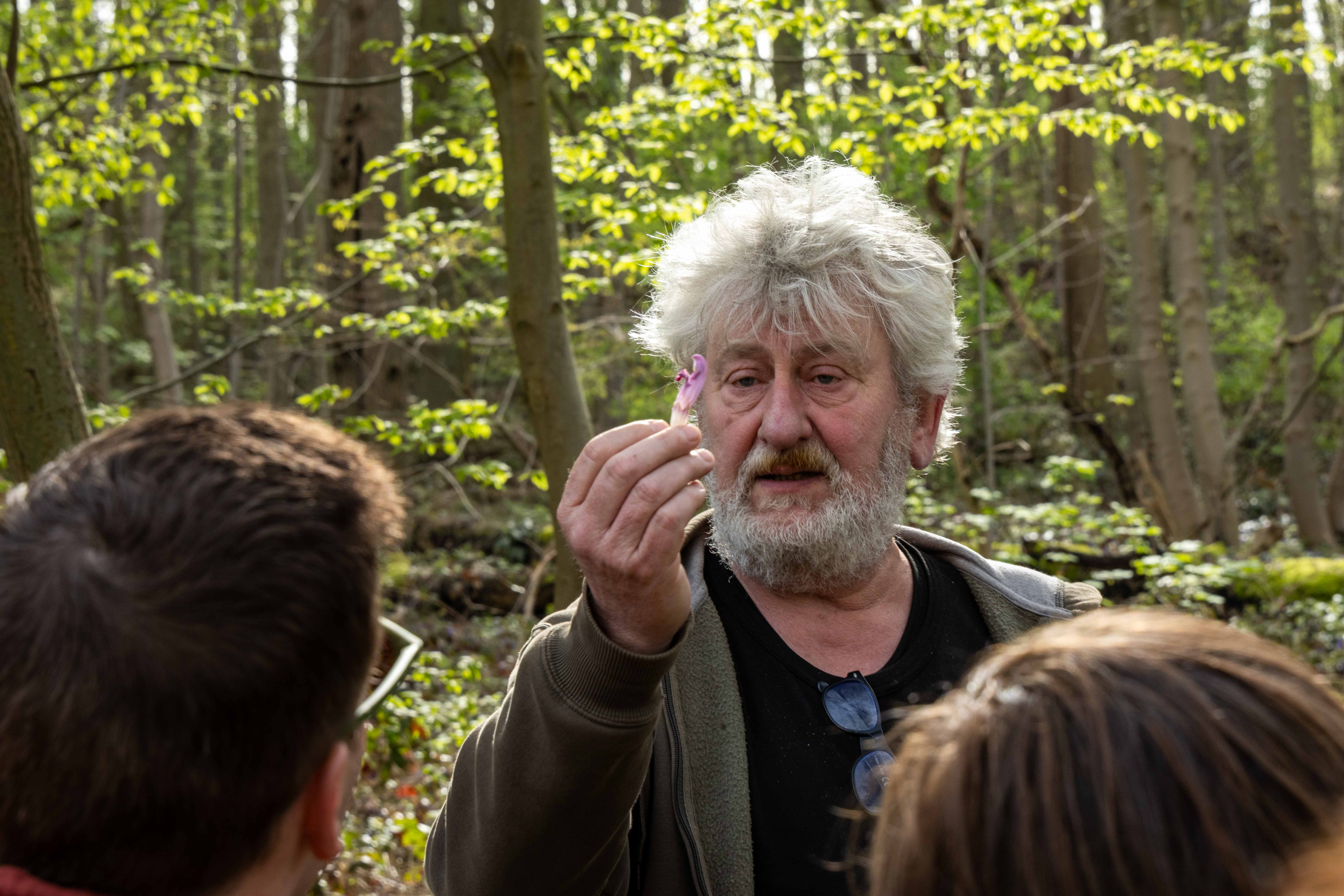 Foto 1: conservator Guido Tack toont Paarse schubwortel (onzelievevrouwkies) tijdens de lentewandeling door Bos t’Ename in 2023 – foto Ewout De Vos